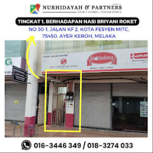 Alamat: NO 30, Peguam Syarie Melaka : Nurhidayah & Partners, 1, Jalan KF 2, KOTA FESYEN MITC, 75450 Melaka, Malaysia.