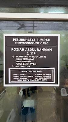 Alamat: R-7, PERSURUHJAYA SUMPAH MERSING ROZIAH ABDUL RAHMAN, Mersing Harbour Centre, Jalan Abu Bakar, Mersing Kechil, 86800 Mersing, Johor, Malaysia.